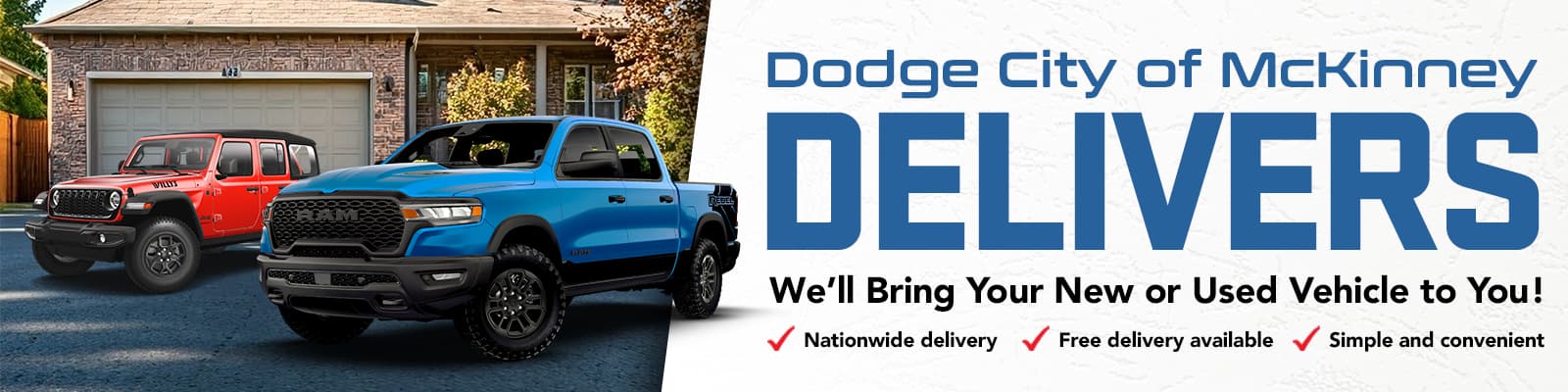 Buying a vehicle should fit your life, not disrupt it. Dodge City Delivery makes it easy to purchase a new or used vehicle online and have it delivered directly to you. From McKinney and across North Texas to destinations nationwide, Dodge City of McKinney offers a convenient, transparent, and customer-focused vehicle delivery experience built around your schedule.