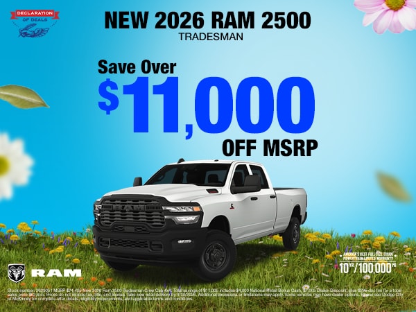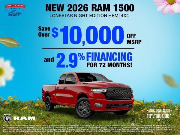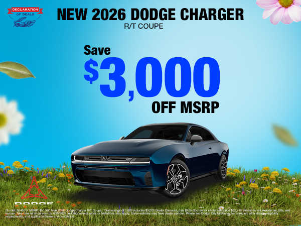 Find current new vehicle specials in one place at CDJR McKinney. Shoppers searching for a Dodge dealership in McKinney or a Chrysler dealership in McKinney can explore lease and financing offers, as well as savings on new Chrysler, Dodge, Jeep, and Ram inventory, right here in McKinney.