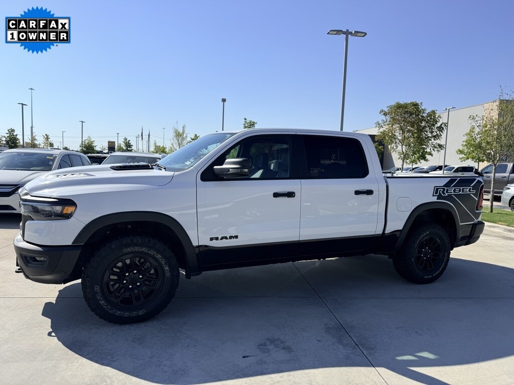 2025 Ram 1500 Rebel Bright White Clearcoat 4WD 8-Speed Automatic 3.0L I6 4G LTE Wi-Fi Hot Spot, Apple CarPlay/Android Auto, Auto Power-Folding Mirrors, Auto-Dimming Exterior Driver Mirror, Black Premium Power Mirrors, Convex Wide-Angle Exterior Mirror Insert, Exterior Mirrors Courtesy Lamps, Exterior Mirrors w/Heating Element, Exterior Mirrors w/Supplemental Signals, GPS Navigation, Navigation System, Power Adjustable Pedals, Quick Order Package 21W Rebel, Rear Window Defroster, Rebel Level 1 Equipment Group, Remote Tailgate Release, Wireless Charging Pad.